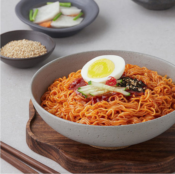 Nongshim's Baehongdong Bibim Myun is a refreshing bibim noodle dish that lets you experience sweet, sour, and spicy flavors all at once. Its chewy noodles are paired with a seasoning sauce made with ground red peppers, pears, and dongchimi (radish kimchi). The deliciously spicy flavor will captivate your taste buds. A generous amount of bibim sauce is included, making it even more delicious. The sesame seed topping adds a nutty texture. Serve the bibim myun with cucumbers, eggs, and other toppings for an even more delicious experience.